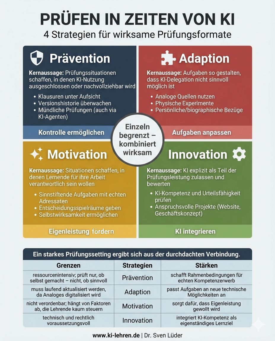 Schaubild zu Prüfungsstrategien, die im KI-Zeitalter funktionieren und gerade in der Verbindung sinnvoll sind: von der Prävention nicht vorgesehener KI-Nutzung über die Adaption von Aufgaben und Motivation zur Eigenleistung bis hin zur Prüfungsinnovation durch KI-Integration.